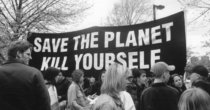 “Glāb planētu. Nogalini sevi!” Tā skan viens no galvenajiem baznīcas saukļiem, kuras pamatā ir ASV izveidota politiska kustība. Tās mērķis? Atjaunot balansu starp cilvēkiem un citām dzīvajām radībām. Citiem vārdiem sakot - mazāk cilvēku, mazāk problēmu.